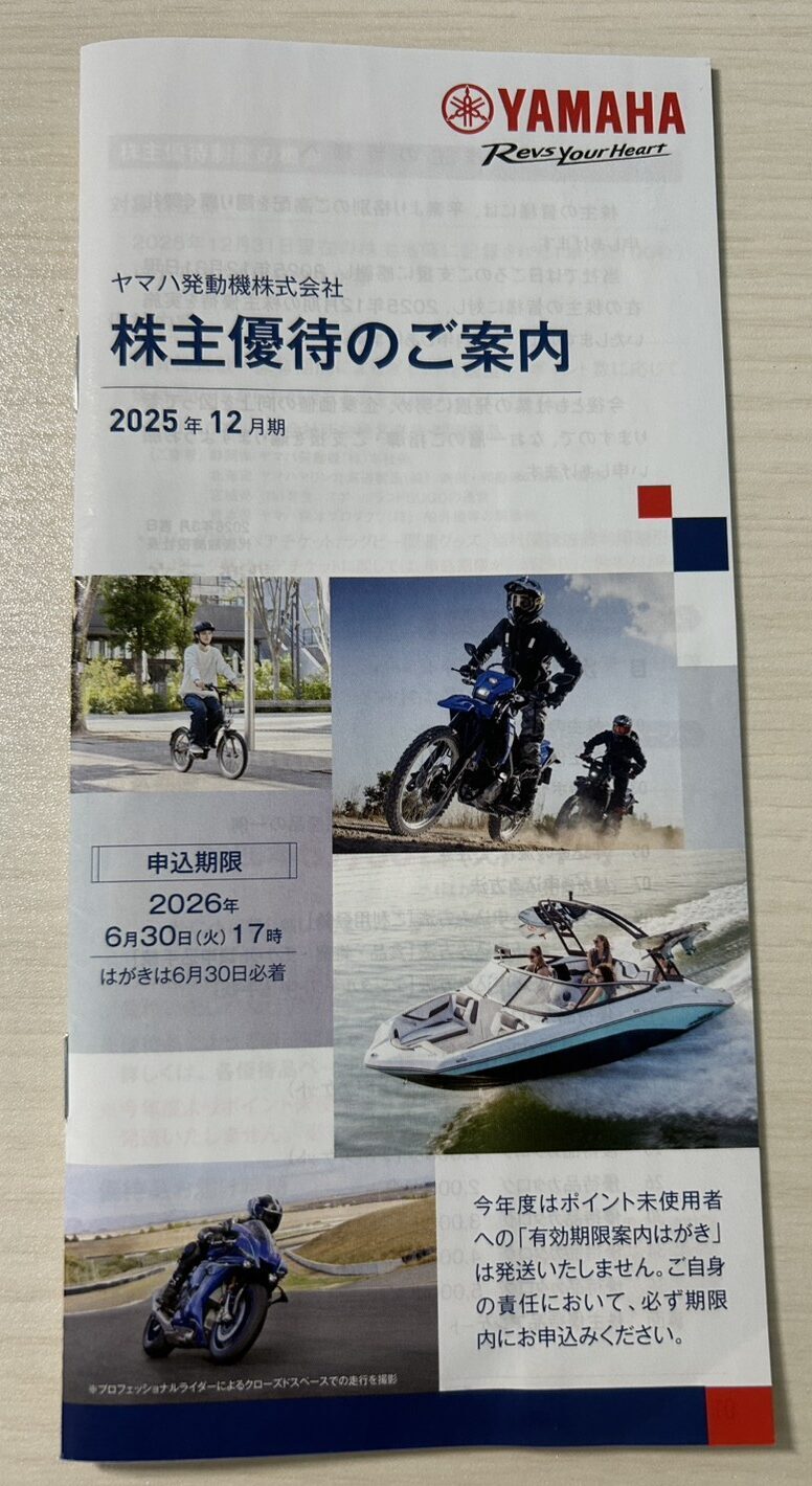 ヤマハ発動機(7272)の株主優待が届いたのでご紹介します!